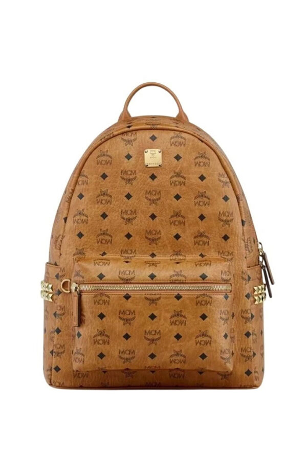 MCM Stark Visetos Monogram Cognac Studded Backpack Coated Canvas Napa Leather