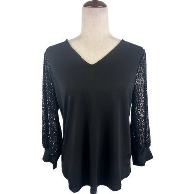 New Adrianna Papell Black V Neck Sequin Sleeve Knit Top Party Blouse Size Medium