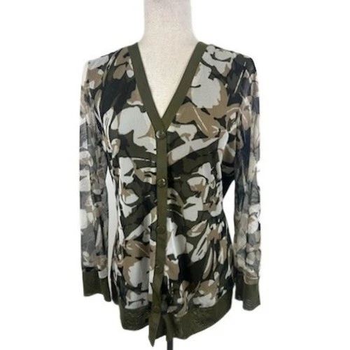 Chico's Olive Green Floral Print Button Cardigan Sweater Blouse Top Size Medium