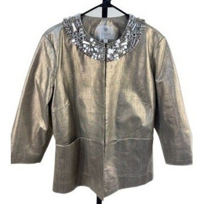 Chico's Women's US Size 12 Large Gold Metallic Leather Crystal Jacket Blazer