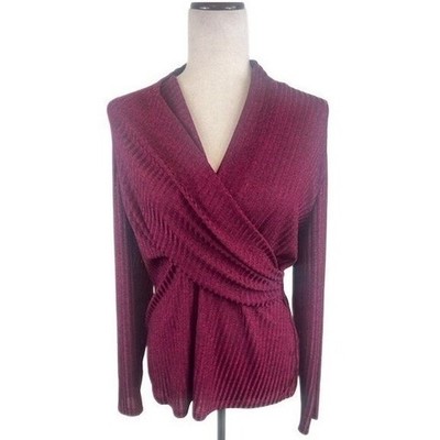 New DKNY Purple Ribbed Knit Faux Wrap Long Sleeve Sparkle Blouse Top Size Large
