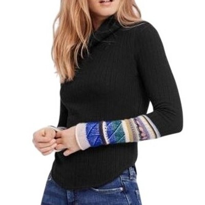Free People Black Ribbed Turtleneck Sweater Striped Cuff Bell Sleeve Size Small