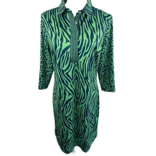 Gretchen Scott Dress Green Blue Animal Print 3/4 Sleeve Scuba Collar Size Large