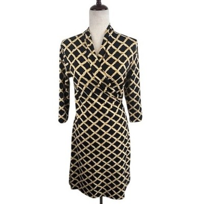 J.McLaughlin Black Gold Lattice Bamboo Faux Wrap 3/4 Sleeve Dress Size XS