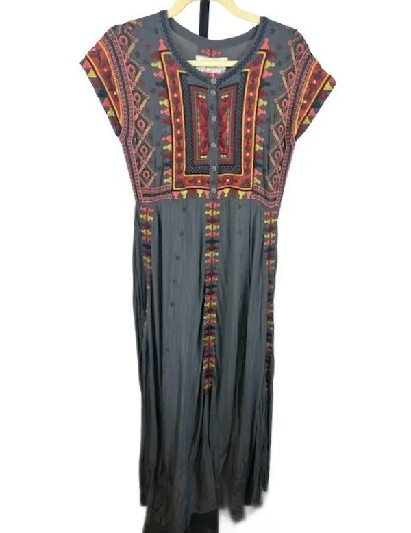Johnny Was Maxi Dress Women's Size Medium Gray Embroidered Bohemian Style Rayon