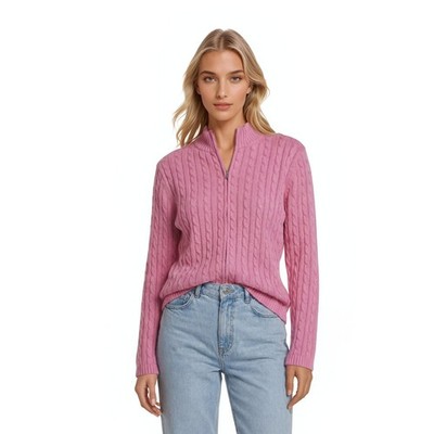 L.L. Bean Sweater Women's Size XL Pink Cable Knit Full Zip Cotton Mock Neck
