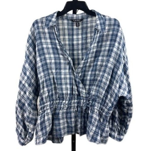 Lauren Ralph Lauren Blouse Women's Size XXL 100% Linen Blue Plaid Faux Wrap Tie