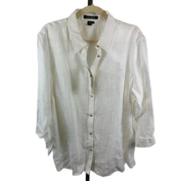 Lauren Ralph Lauren Women's 2X White 100% Linen Button Blouse Shirt Top