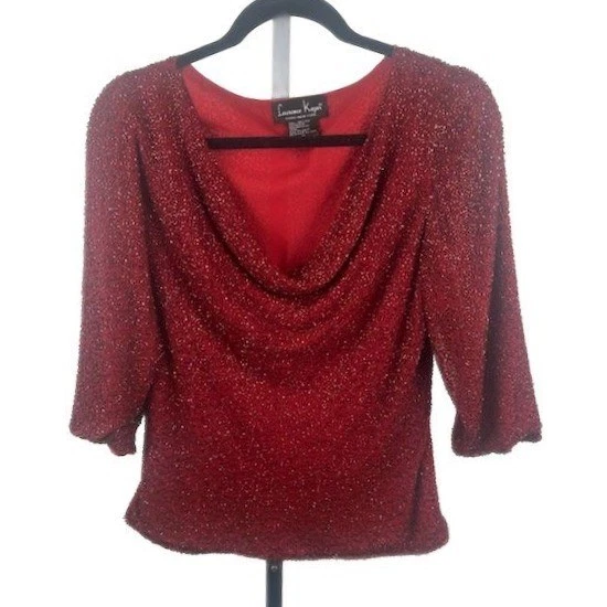 Laurence Kazar Red Silk Beaded Top 3/4 Sleeve Party Holiday Blouse Size Medium