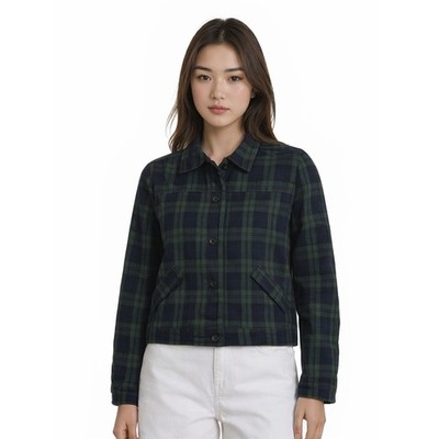 Levi's Trucker Crop Jacket Women's Size Large Green Navy Blackwatch Plaid Coat