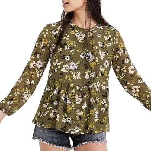 Madewell Green Floral Print Tiered Peplum Long Sleeve Top Blouse Size Small