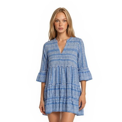 Mud Pie Dress Women's Size Small Blue White Geometric Tiered Bell Sleeve Mini