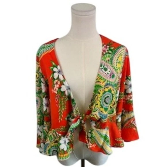 Mustard Seed Floral Print Tie Front Blouse Bell Sleeve Top Orange Size Medium