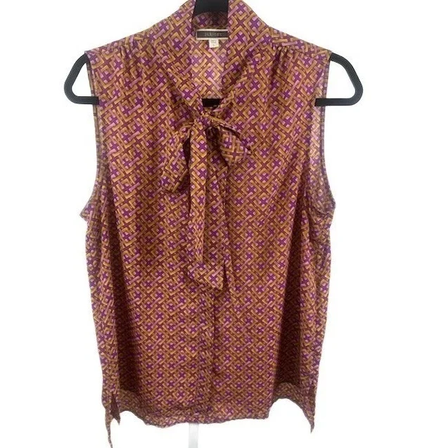 Pleione Women's Size Large Purple Geometric Sleeveless Bow Neck Blouse