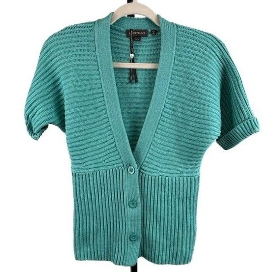 New Repeat Turquoise Blue Ribbed Short Sleeve Cardigan Sweater Size 38 Small