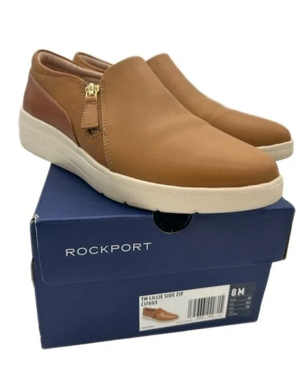 Rockport Ankle Boots Women's Size 8 M Lillie Side Zip Tan Leather Wedge Heel New