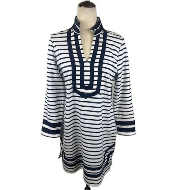 Sail to Sable STS Tunic Dress Navy Stripe Nautical 3/4 Sleeve Cotton Size Medium