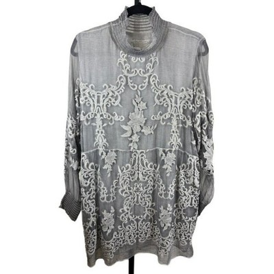 Soft Surroundings 100% Silk Gray Long Blouse Embroidered Tunic Top Large