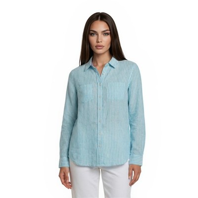 Talbots 100% Linen Blouse Women's Size Small Blue White Striped Button Shirt