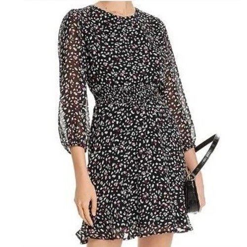 AQUA Black Floral Print Long Sleeve Dress Smocked Waist Ladies Size Large