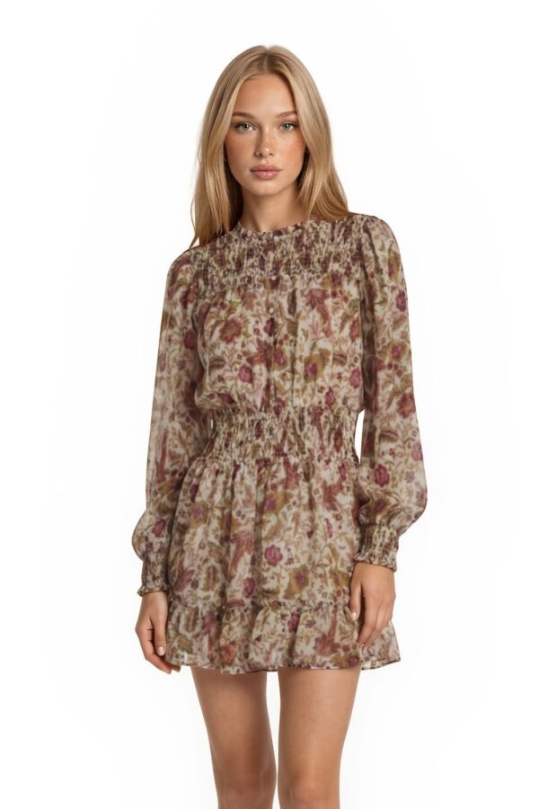 New Fate Mini Dress Women's Size Large Cream Burgundy Floral Smocked Metallic