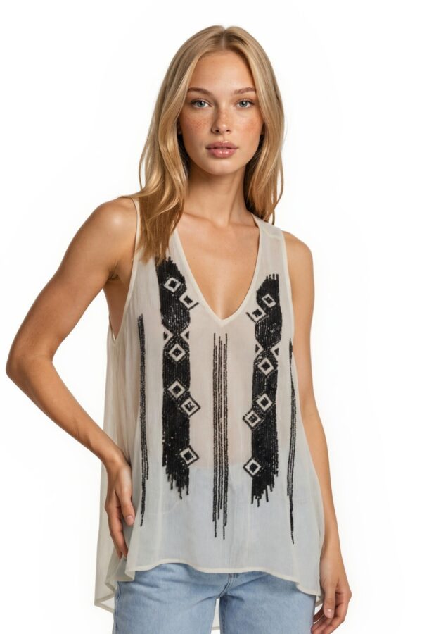New Fifteen Twenty Women's Size Small Cream Black Beaded Sequin Tunic Blouse Top
