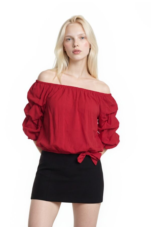 NWT CeCe Blouse Womens Size Medium Red Off Shoulder Ruffle Sleeve Tie Hem