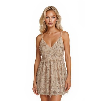 NWT Showpo Sequin Fringe Mini Dress Women's Size 8 Champagne Gold V-Neck