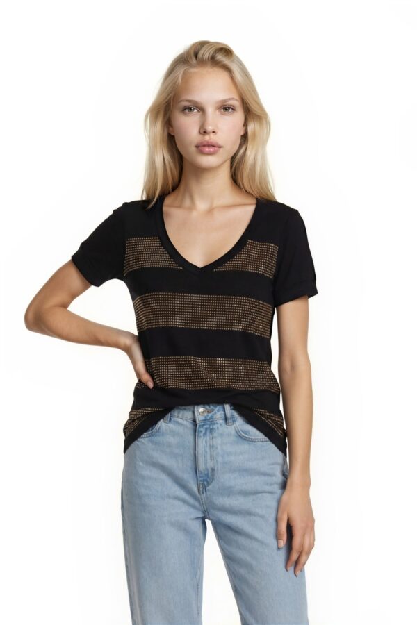 NWT Stella & Jamie Studded Top Women's Size Small Black Bronze Striped V-Neck