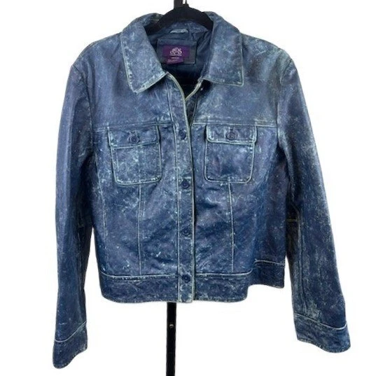 Vintage JDS Women's Jacket Coat Size Medium Blue Distressed Leather Trucker Y2K