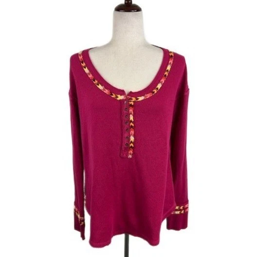 We The Free People Thermal Top Long Sleeve Henley Pink Embroidered Size Medium