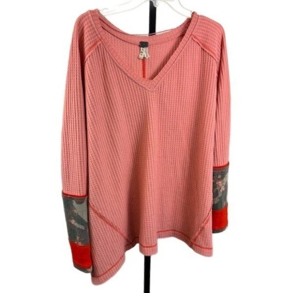 We The Free People Top Women's Size Medium Coral Oversize Waffle Patchwork Tunic