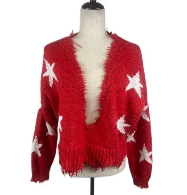 Wildfox Star Sweater Womens Cropped Distressed Knit Deep V Neck Pullover Size XS