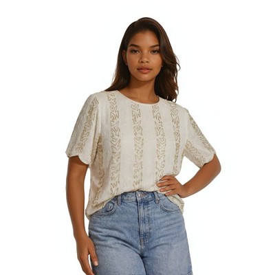 SHEIN Womens Size Medium White Star Mesh Sheer Crop Top Short Sleeve Crew Neck
