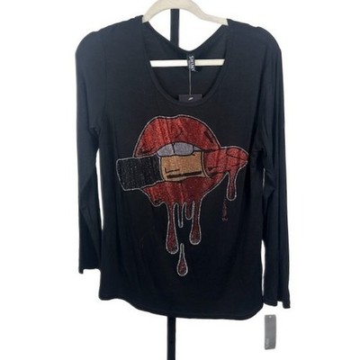Shiny New York Black Long Sleeve Lipstick Crystal Lips Top Blouse One Size M/L