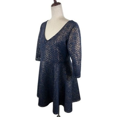 SHE Dress Women's Size Medium Navy Gold Textured V-Neck 3/4 Sleeve Fit & Flare