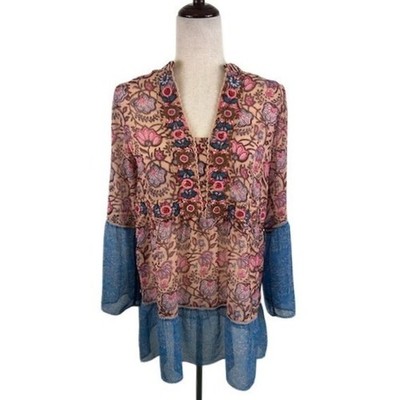 Soft Surroundings Floral Embroidered Bell Sleeve Tunic Top Blouse Long Size XS