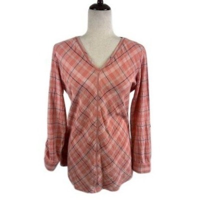 Soft Surroundings Plaid V-Neck Long Sleeve Top Blouse Peach Coral Size XS