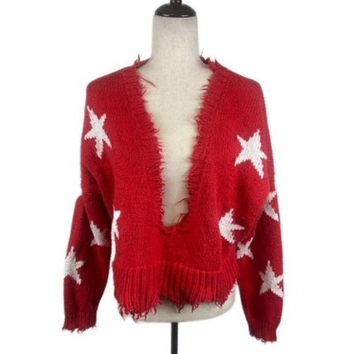 Wildfox Star Sweater Womens Cropped Distressed Knit Deep V Neck Pullover Size XS