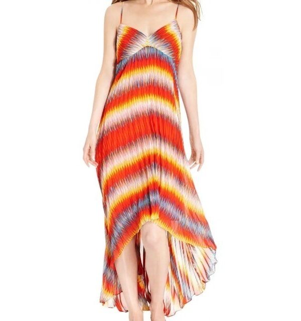 Calvin Klein Maxi Dress Pleated High Low Striped Orange Yellow Women's Size 14