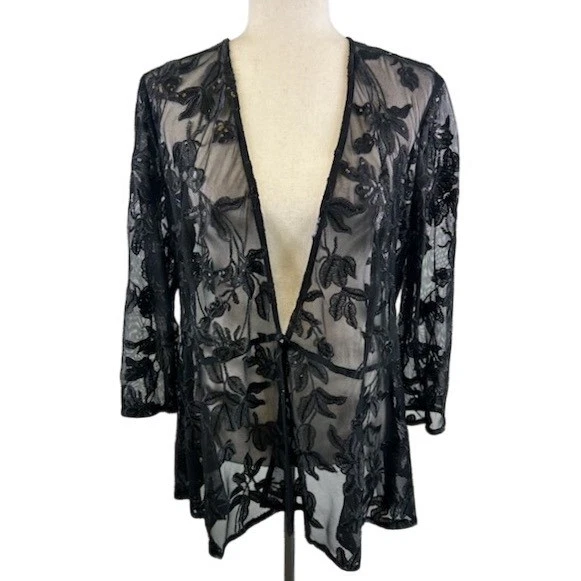 Alex Evenings Black Floral Lace Sequin Sheer Cardigan Jacket Size Large