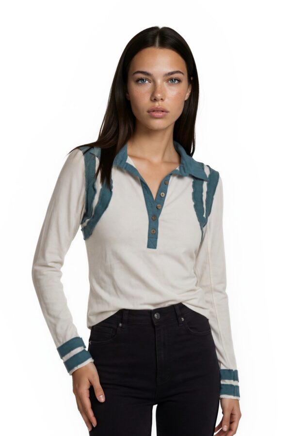 Free People Women's Size Small Teal Ivory Ruffle Trim Henley Long Sleeve Top