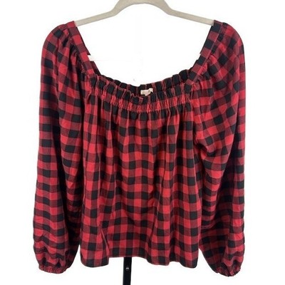JODIFL Women's Size Small Red Black Buffalo Plaid Smocked Peasant Top