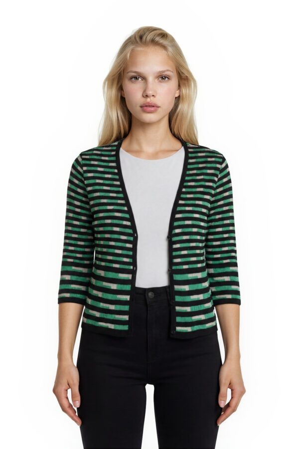 Ming Wang Knit Cardigan Sweater Blazer Womens Size PM Green Black Striped Jacket
