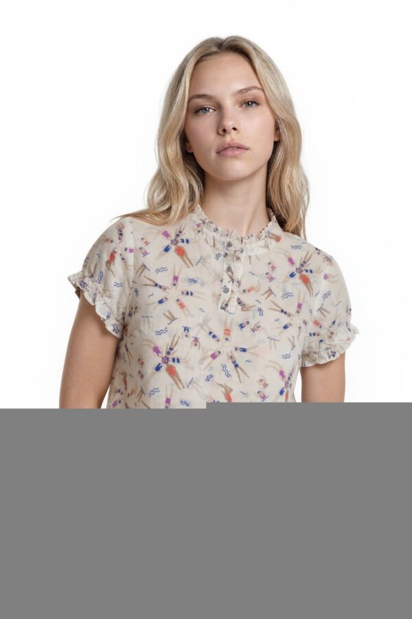 ModCloth Blouse Women's Size XL White Swimmer Print Ruffle Short Sleeve