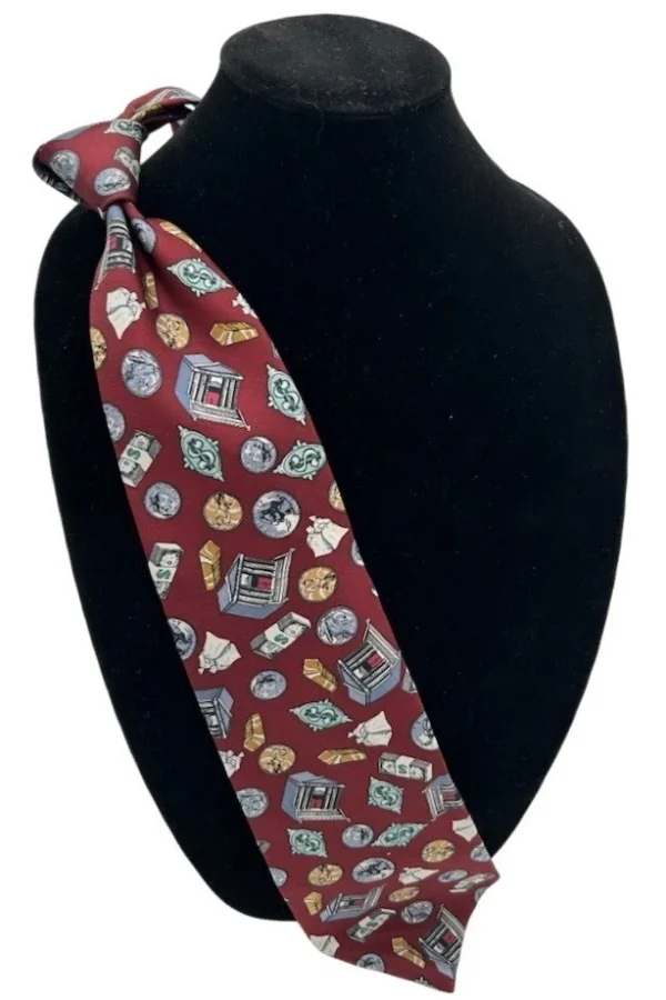 Oscar de la Renta Couture Banker Print Silk Necktie Burgundy Coins Money Career