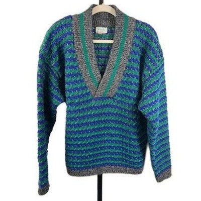 Benetton Sweater Men's Size 50 Large Blue Green Gray Striped Wool Vintage
