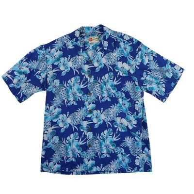 Hilo Hattie Shirt Mens Size Large Blue Pineapple Floral Hawaiian Shirt Vintage