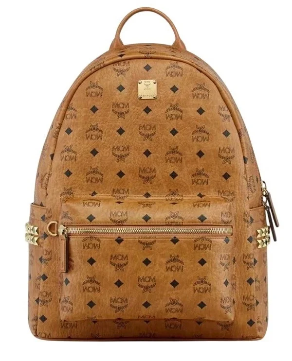 MCM Stark Visetos Monogram Cognac Studded Backpack Coated Canvas Napa Leather