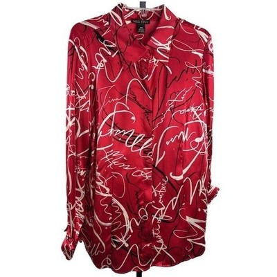 Vintage Miss Tina Women's Size 18W Red 100% Silk Script Print Button Up Blouse